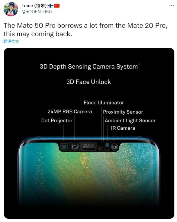 正好推特爆料人士特米放出了一张华为 Mate 20 Pro 的海报,暗示华为 Mate 50 Pro 从 Mate 20 Pro 上“借”来了很多,“这个”可能会回归。