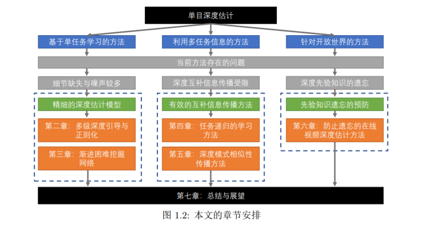 单目图像的深度估计是计算机视觉研究的基础性课题,由于其可以指导多种高 阶视觉任务的学习,且具有良好的实际应用前景,近年来也成为计算机视觉领域的 热门课题。单目深度估计旨在基于单张图片或单目视频信息,预测并恢复出场景像 素级别的深度信息。由于现实场景较为复杂,且单目图像或视频信息又缺乏鲁棒的 几何约束,现有的深度估计方法往往会丢失细节或无法预测正确的尺度信息,使得 其实际应用受到制约。本文通过设计有效的深度卷积网络及其学习框架,提出了几 种新的深度估计方法。主要研究成果概述如下: