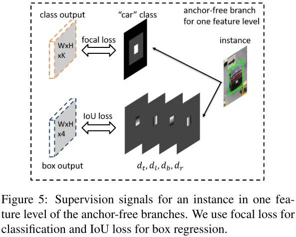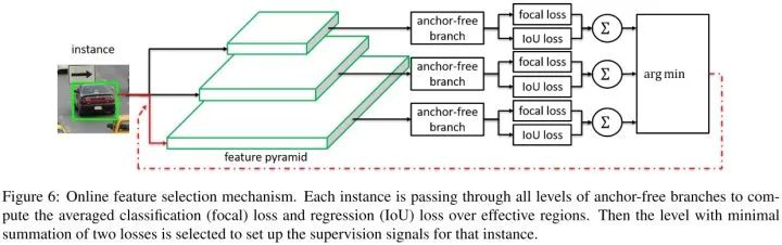 实例输入到特征金字塔的所有层,然后求得所有anchor-free分支focal loss和IoU loss的和,选择loss和最小的特征层来学习实例。训练时,特征根据安排的实例进行更新。推理时,不需要进行特征更新,因为最合适的特征金字塔层自然地输出高置信分数。