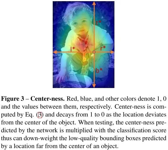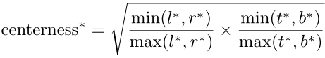开根号使center-ness衰退缓慢。center-ness范围为0-1之间,通过BCE训练。测试时,最终分数由center-ness预测结果和分类分数乘积得到。
