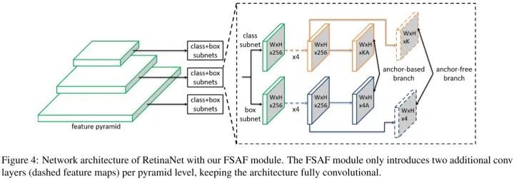 在RetinaNet的基础上,FSAF模块引入了2个额外的卷积层,这两个卷积层各自负责anchor-free分支的分类和回归预测。具体的,在分类子网络中,feature map后面跟着K个3x3的卷积层和sigmoid,在回归子网络中,feature map后面跟着4个3x3的卷积层和ReLU。