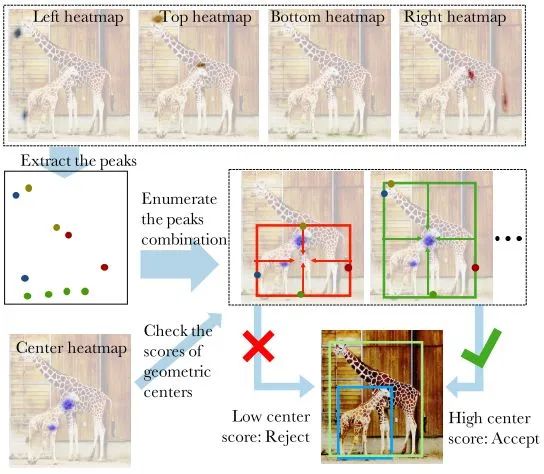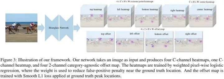 作者使用了最佳的关键点估计框架,通过对每个目标类预测4个多峰值的heatmaps来寻找极值点。另外,作者使用每个类center heatmap来预测目标中心。仅通过基于几何的方法来对极值点分组,如果4个极值点的几何中点在center map上对应的分数高于阈值,则这4个极值点分为一组。