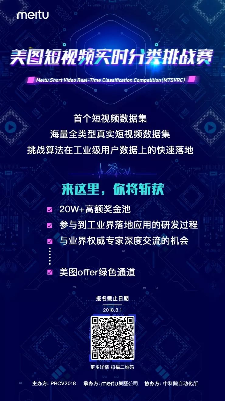 「美图短视频实时分类挑战赛 MTSVRC」于近日正式启动,本次挑战赛由中国模式识别与计算机视觉学术会议主办,由美图公司承办,中科院自动化所协办。