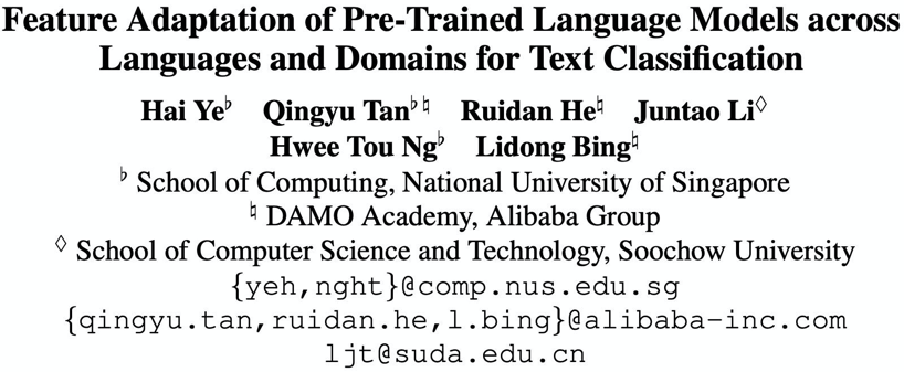 本篇论文的问题设置是典型的无监督领域迁移。给定源领域的标注数据 和目标领域无标注数据 ,训练一个模型,测试其在目标领域数据集 上的效果。我们依然专注文本分类的问题,而且也同时考虑跨领域和跨语言的设定。为了做到跨语言,同样地,我们采用了多语言预训练模型(XLMR)作为下层的特征编码器。