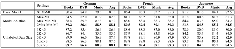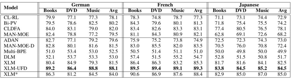 上表给出了各个模型的对比实验结果(accuracy),从中我们可以看到 XLM 是一个非常强的基础模型,在最近提出的非预训练模型 MAN-MOE-D 上取得了明显的效果提升(法语和日语)。我们还观察到预训练的领域语言模型 DLM 远远弱于 XLM,这说明以语言模型为基础的表示学习手段对训练数据量级的要求很高。