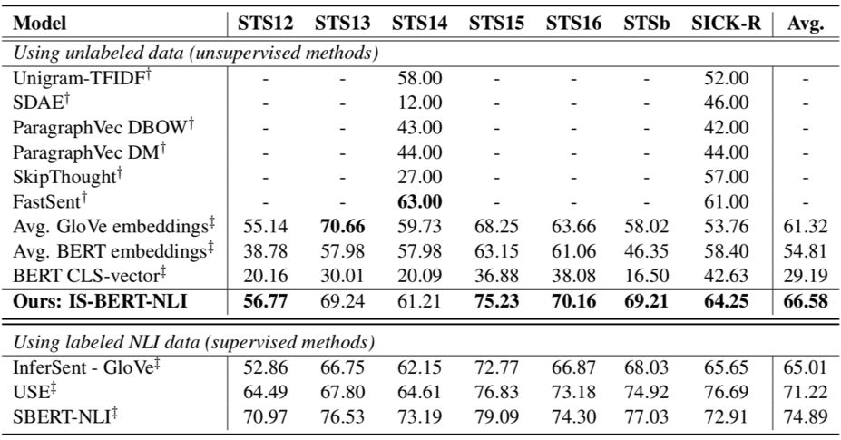 从表 1 中我们可以看到所有的有监督方法(SBERT, USE, InferSent)都优于其他的无监督模型。这很大程度上是因为 NLI 数据集和 STS 数据集比较相关,通过在 NLI 数据上进行有监督训练得到句子表征信息比较适用于这组 STS 任务。