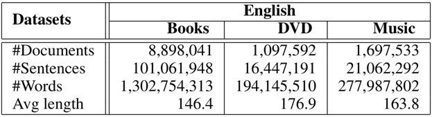 我们在文本情感分类任务上进行了实验。在实验中,我们首先使用了源语言(英语)的无标注数据(unlabeled data)[3],包括三个不同的目标领域,即 Book、Dvd、Music。该数据集用来训练 UDF,其具体的统计信息如上表所示。