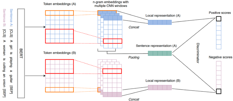 模型工作流程如下。句子输入到 BERT 后被编码,其输出的 token embeddings 通过多个不同 kernel size 的一维卷积神经网络 (CNN)得到多个 n-gram 特征。我们把每一个 n-gram 特征当成局部表征(Local representation), 将平均池化(Mean Pooling)后的局部表征称为全局表征(Global representation)。