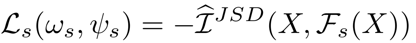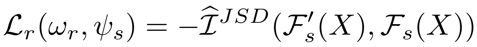 的作用是从预训练模型输出的特征中提取到领域共享(domain-invariant)的特征。我们提出通过最大化 输入和输出的互信息(mutual information (MI))这一自学习方式来训练 的参数,其损失函数 如下,这里我们用到了 Jensen-Shannon MI estimator 来估算互信息 [1] :