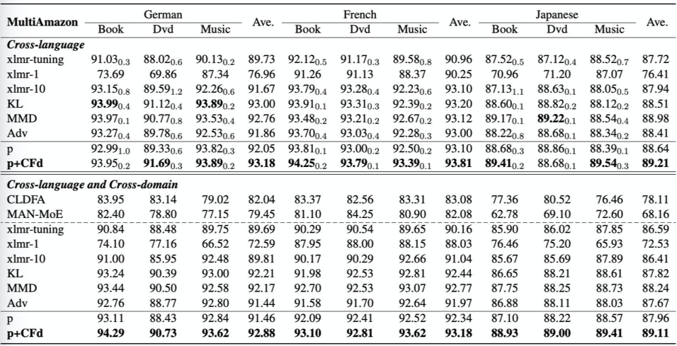 我们在文本情感分类任务上实验了提出的算法,使用到了单语言(MonoAmazon [4])和多语言(MultiAmazon [5])两个数据集。其中,单语言有 4 个 domain,包括 Book, Electronics, Beauty 以及 Music;多语言包括了英语、德语、法语和日语,每个语言包括了 Book, Dvd 和 Music 3 个 domain。
