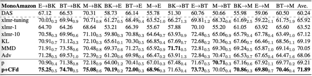 以下是我们的实验结果(accuracy),从实验结果中我们可以发现,对比自训练的基准模型 (p),我们的算法(p+CFd)无论在跨 domain 还是跨 language 的设定上都有稳定且显著的效果提升。