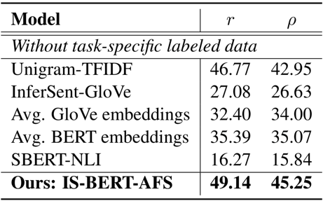 在这种情况下 SBERT 只能先在 NLI 上学习句子编码,然后在这个数据集上测试。由于 NLI 和这个 argument 数据集语义差距很大, SBERT 在这种情况下的表现很差。我们提出的 IS-BERT 由于是无监督的,可以直接在 task-specific 的无标签文本上进行训练,固而在这种场景下表现显著优于其他方法。