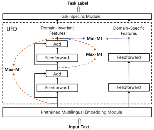的作用是从预训练模型输出的特征中提取到领域特有(domain-specific)的特征。我们提出通过极小化 和 输出之间的互信息这一自学习方式来训练 ,通过极小化互信息, 抽取到的是完全独立于 的特征。由于 抽取的是领域共享特征, 抽取的可以被视为领域特有的特征。其损失函数如下:
