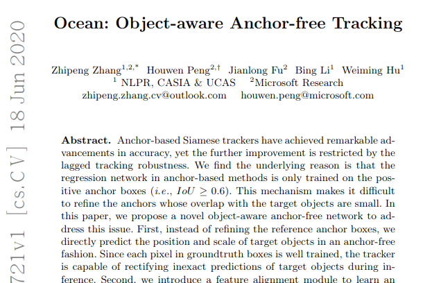 《Ocean: Object-aware Anchor-free Tracking》 其ECCV 2020论文名为:《Learning Object-aware Anchor-free Networks for Real-time Object Tracking》
