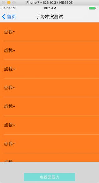 OK,现在回到现象一。按照之前的分析,快速点击cell,讲道理不管是表现还是日志都应该和现象二一致才对。然而日志仅仅打印了手势识别器的action执行结果。分析一下原因:GLTableView的 touchesBegan 没有调用,说明事件没有传递给hit-tested view。那只有一种可能,就是事件被某个手势识别器拦截了。目前已知的手势识别器拦截事件的方法,就是设置 delaysTouchesBegan 为YES,在手势识别器未识别完成的情况下不会将事件传递给hit-tested view。然后事实上并没有进行这样的设置,那么问题可能出在别的手势识别器上。