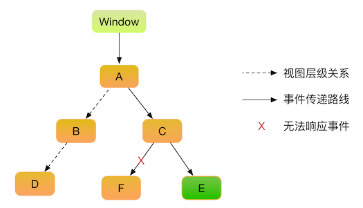 C判断自身能响应事件,继续将事件传递给F(同理F比E后添加)。