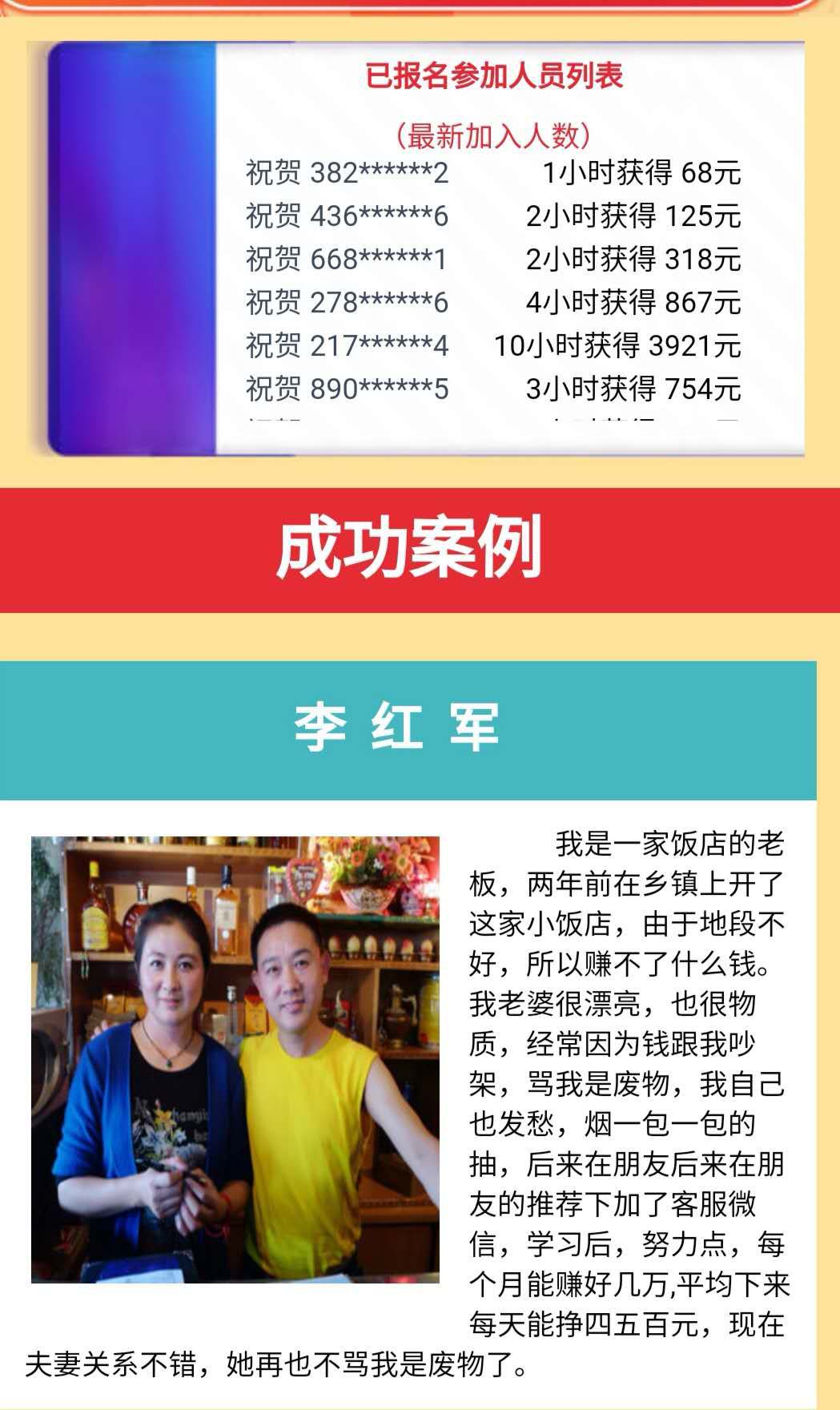 这些微博广告的共同点,是博文中都拥有一条外链到“兼职主管”的链接,点进链接,我们可以看到一个粗制滥造的网页,里面写着一个个“励志故事”。其中有在乡镇开饭店的老板,因为加了客服微信,每个月能多挣几万元,“再也不被老婆骂废物了”;还有四十岁的主妇,因为没钱没办法打扮自己,老公对她越来越不好了,但当做了兼职之后,每天能挣六百多元,拿着钱去美容院,“老公对我也越来越好了”。