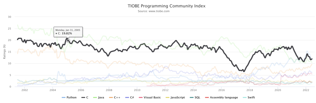 Top 10 编程语言 TIOBE 指数走势(2002-2022)