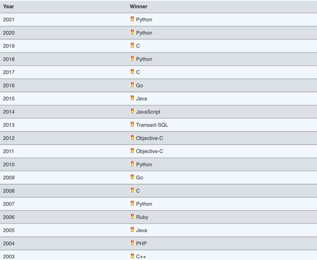 根据 TIOBE 历年的榜单显示,2020 年 4 月,Java 仍然是 TIOBE 指数的第一名。然而同月,Java 第一的宝座就被 C 占领了。后来,在 2021 年,Python 在人工智能这条大船下势不可挡,也超越了 Java。