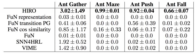从实验结果上看,作者提出的HIRO在这一系列复杂任务中取得了很好的效果。下图中FuN是Feudal Networks[9]。FuN representation, FuN transition PG, FuN cos similarity为Feudal Networks[9]中作者提出的3个trick,实验中将这3个trick应用到HIRO上,发现效果反而不好。SNN4HRL[11]是将Stochastic Neural Networks应用到HRL中,VIME是一个非Hierarchical的模型。