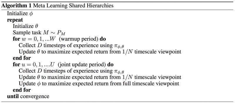 考虑一个马尔科夫决策过程 (MDP) 中的连续Action轨迹:a1, a2, a3 ... at。连续Action的抽象即是说,定义一个Skill,使用这个Skill就意味着输出这个Action序列:a1, a2, a3 ... at。自动学习连续Action的方法有使用类似EM方法的DDO[6],以及Meta-Learning Shared Hierarchies (MLSH)[7],接下来我着重介绍下MLSH的工作。