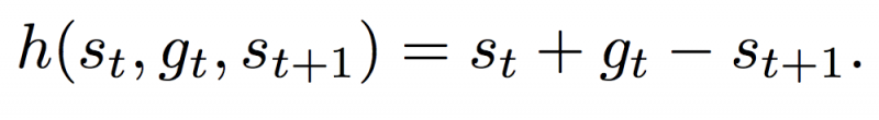 论文的主要思想如上图所示,首先从环境得到状态表示,高层μ(hi)在大时间尺度上作决策,低层μ(lo)在小时间尺度上做决策。高层决策时,生成一个目标交给低层,低层则不断通过Actions与环境交互去实现这个目标。图中的h是指的目标转移函数 (Goal Transition Function),定义如下: