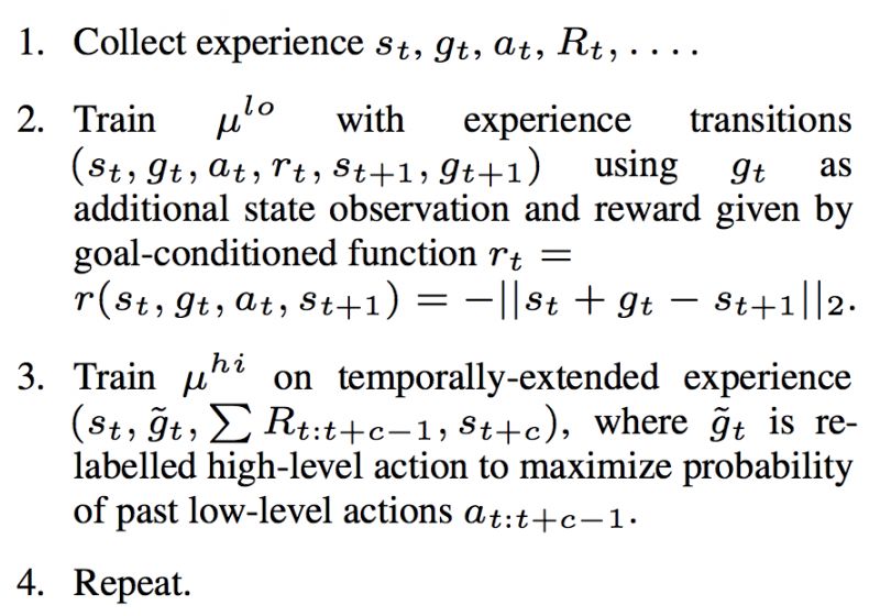 Data-Efficient Hierarchical Reinforcement Learning(DE-HRL)[8]是一篇Google今年5月23日放在Arxiv上的文章,主要思想是上层生成子目标交给下层完成。该文章实际上是对Feudal Networks[9]的改进,使得模型可以Off-policy地训练,并去掉了Feudal Networks中的一些Tricks。