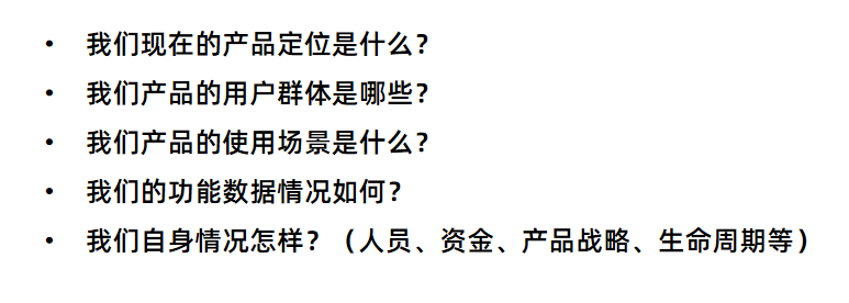 可见,增强对自身产品的认知,明确自身产品定位,正确选取竞品是做好竞品分析的关键之一。在做竞品分析之前,我们可以想清楚下列问题,更好的增强对产品的认知。
