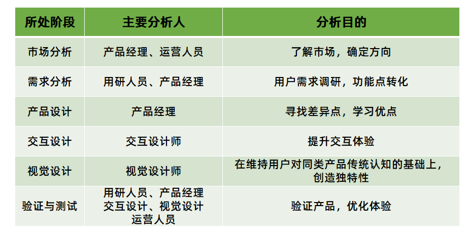 就像竞品分析,从产品系统出发,当产品处于市场分析阶段,竞品分析的目的是了解市场、确定方向;而当产品处于设计阶段时,竞品分析的目的是寻找差异点,学习竞品的优点。