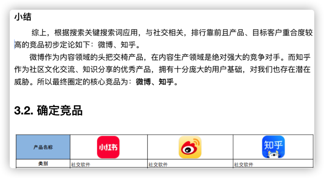 上图,A同学将小红书定位为社交产品,所以最终选定的竞品为:微博和知乎;