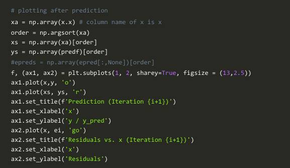 我们可以看到,即使在第50次迭代之后,残差对x的曲线看起来也与我们在第20次迭代中看到的相似。 但是,模型变得越来越复杂,预测过度的训练数据,并试图学习每个训练数据。 所以,最好是停止在第20次迭代。