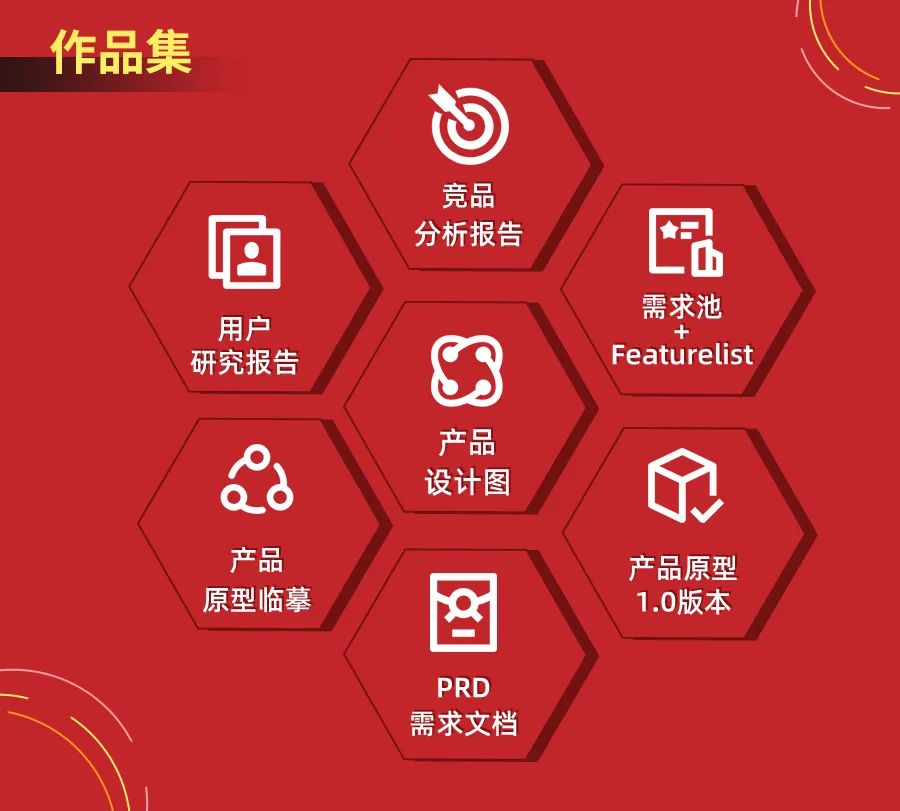 还可以是自己所做过的一些市场分析报告、需求池+FeartureList、流程图、架构图、原型、PRD等。突出表现出产品经理的基本技能及逻辑能力。