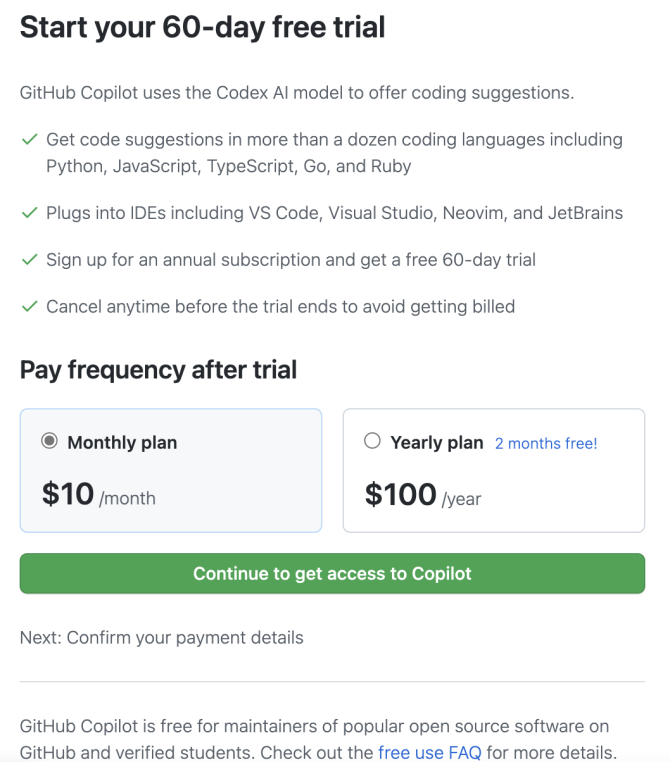而如今,Copilot 也已经开启收费模式。现以每月 10 美元(人民币约 67 元)或每年 100 美元(人民币约 669 元)的价格出售,并提供 60 天的免费试用期。