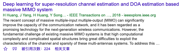 黄同学18年发表的一篇高引论文「Deep learning for super-resolution channel estimation and doa estimation based massive mimo system」,Google Scholar统计的引用频率高达224次。IEEE出版社的统计是149次,其中自引30次,被IEEE Access引用81次。