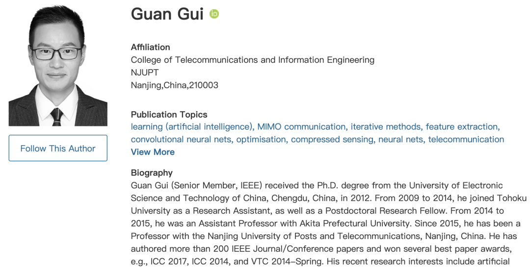 履历上写着,他曾荣获多项最佳论文奖,包括2014年获得IEEE VTC最佳学生论文奖和IEEE ICC最佳论文奖,2017年再次获得IEEE ICC最佳论文奖。