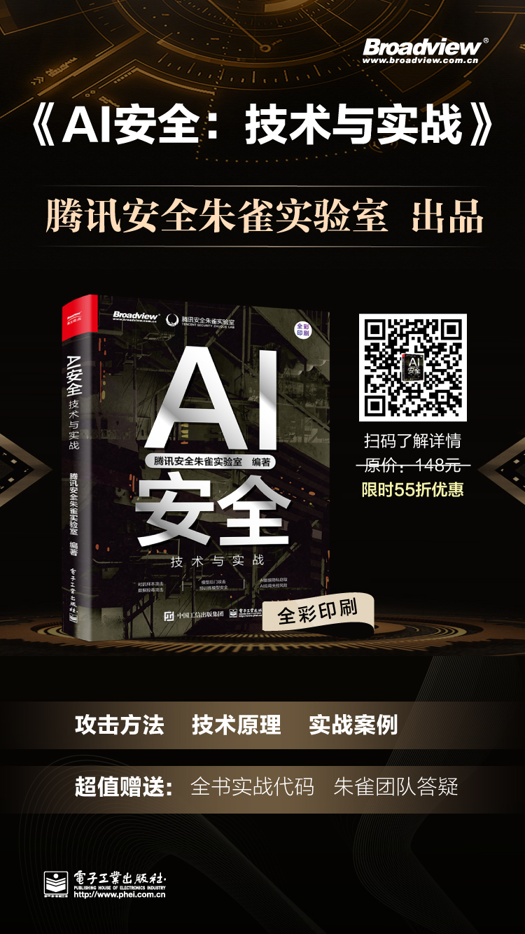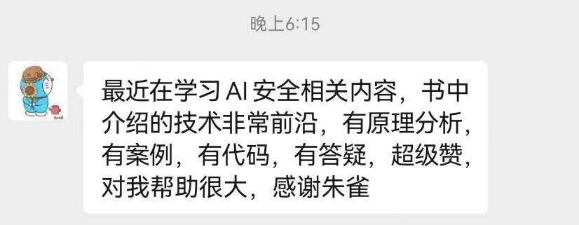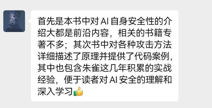 这本书凝聚了朱雀团队在AI安全技术的研究和实践中积累的多年经验,我相信这本书将对AI安全领域的研究人员和管理人员带来极大的帮助。