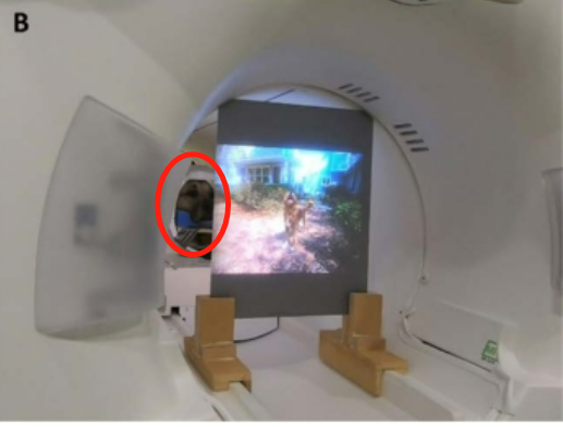 实验设计:首先使用 3T MRI 扫描参与者,同时让参与者观看投射到 MRI 孔后部屏幕上的汇编视频。对于狗来说,通过事先训练,将它们的头放在定制的下巴托中,以达到头部稳定的位置,就像下图这样