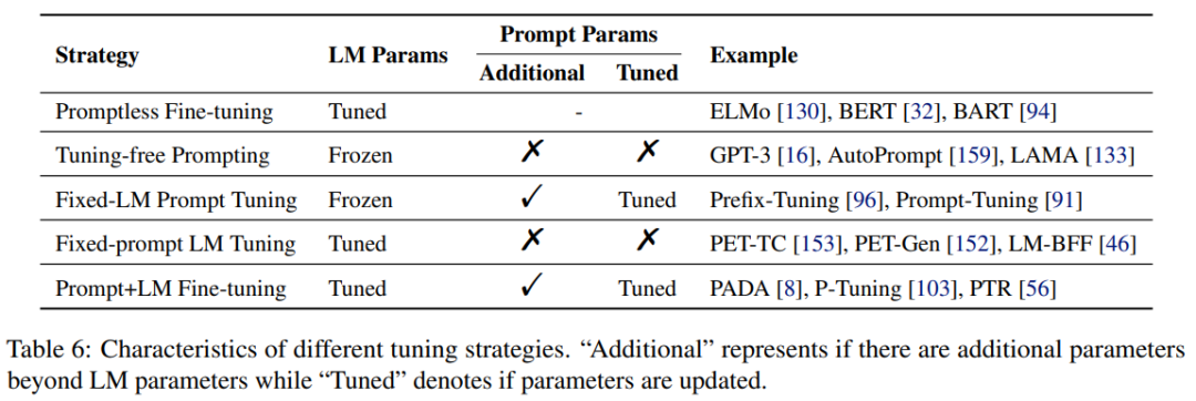 研究者基于底层语言模型的参数是否需要调整、是否有额外的 prompt 参数和这些额外的 prompt 参数是否需要调整这三个方面总结以下 5 种调整策略,如下表 6 所示,它们分别为: