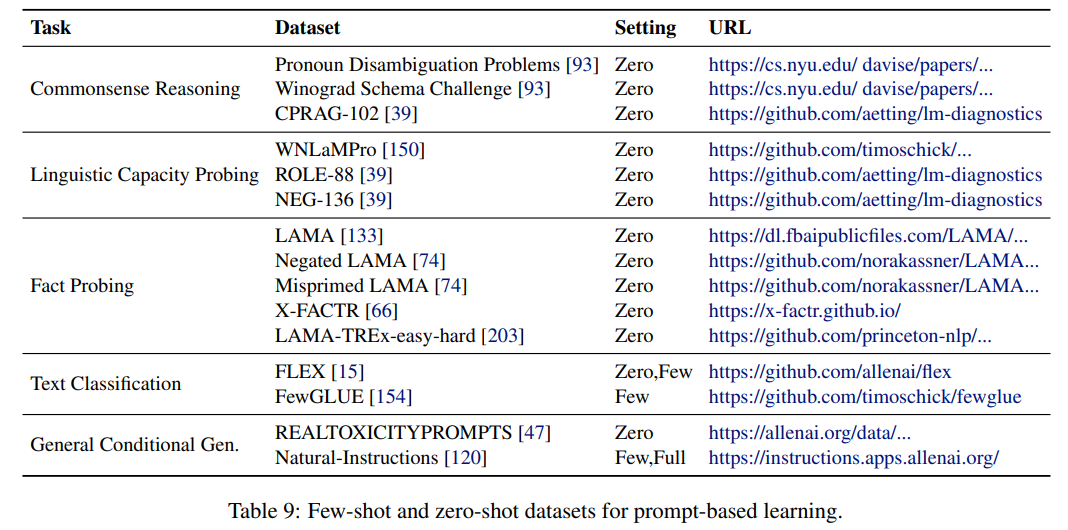 研究者为不同的 prompt 应用收集了一些有用的资源,并且设计用于少样本和零样本学习的一些数据集如下表 9 所示: