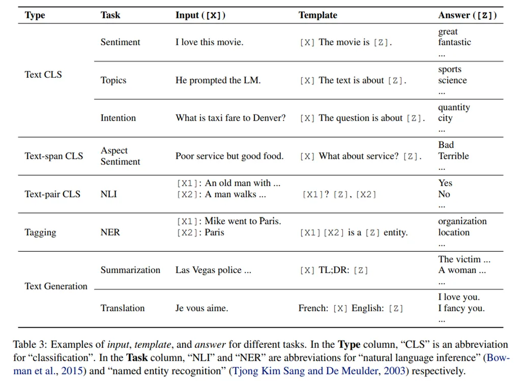 下表 3 为不同任务的输入、模板和 answer 示例:
