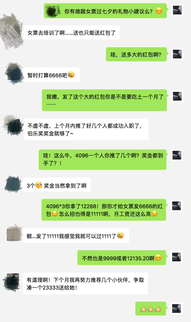 天哪噜!伯乐奖奖金拿到手就给女票发大红包,这位同学果然是一个爱女票也爱工作还爱同事的博爱选手。
