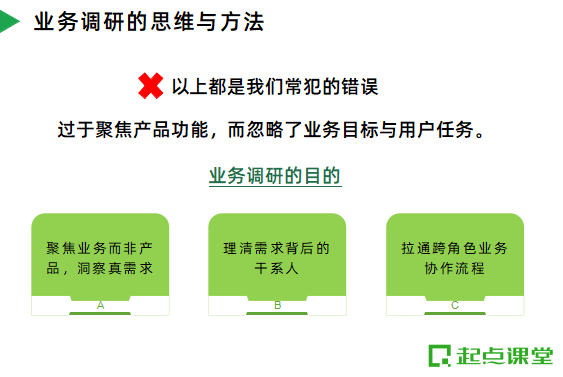 这个部分,老师会盘点梳理日常工作中,做业务调研的错误思路,并教大家正确的调研思维与方法。