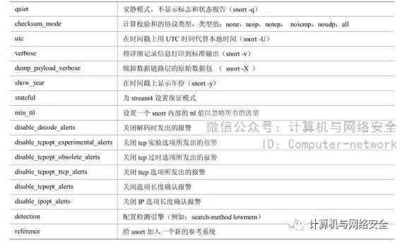 除了规则之外,Snort还支持一些配置和定义选项,常见的选项见表1。