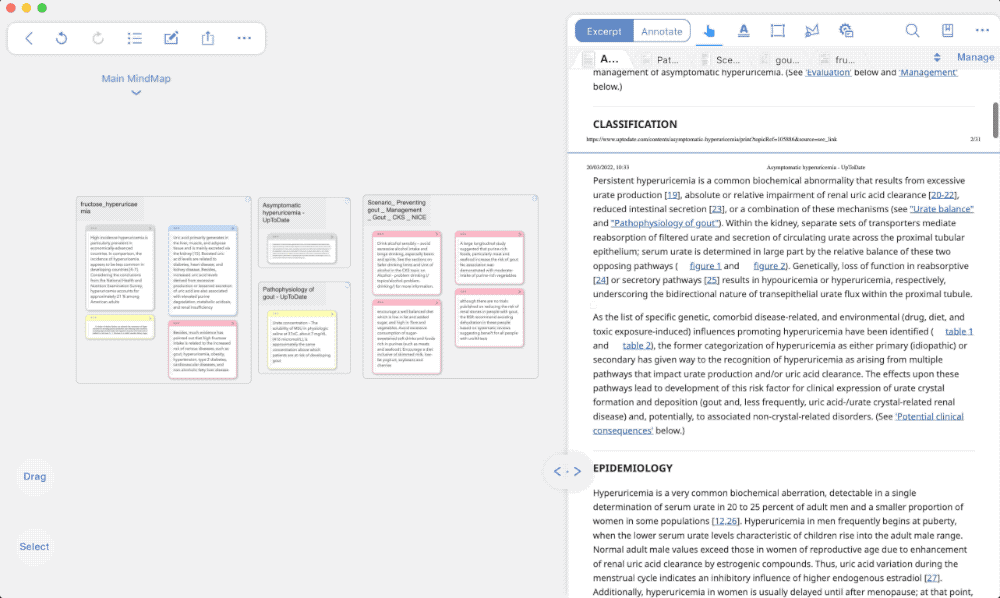 把这两部分分别拎出来看,思维导图 App 和 PDF 阅读器里有的基础功能,这里面都有。但让 MarginNote 区别于其他软件的,就是「文档中高亮的部分可以自动加入思维导图中」——这个功能简直是为我写作流程中「收集信息」和「整理结构」这两步量身定做的。