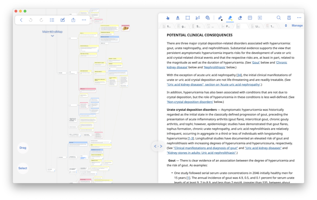 看文章时在编辑器里像往常一样高亮、批注,摘录出有用的段落;等有了些想法,就去思维导图区整理思路。高亮和批注可以直接加进导图里,互相关联,如此往复,省却在多个软件里跳转的麻烦。