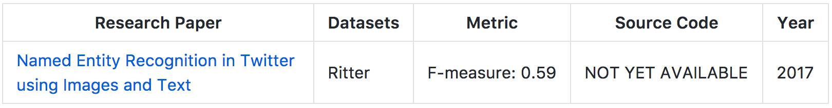 波恩大学 Diego Esteves 等研究者在推特上使用图像和文本进行命名实体识别,在该论文中,他们提出了一种新颖的多层级架构,该架构并不依赖于任何具体语言学的资源或解码规则。他们的新型模型在 Ritter 数据集上 F-measure 实现了 0.59 的优秀表现。