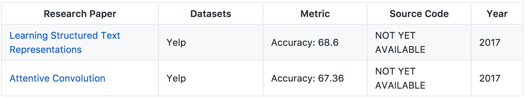 爱丁堡大学的 Yang Liu 等人提出了学习结构化的文本表征,在这篇论文中,他们关注于在没有语篇解析或额外的标注资源下从数据中学习结构化的文本表征。虽然目前暂时还没有相应的实现代码,不过他们在 Yelp 数据集上准确度能达到 68.6。而另一篇带注意力的卷积提出了了一种 AttentiveConvNet,它通过卷积操作扩展了文本处理的视野。