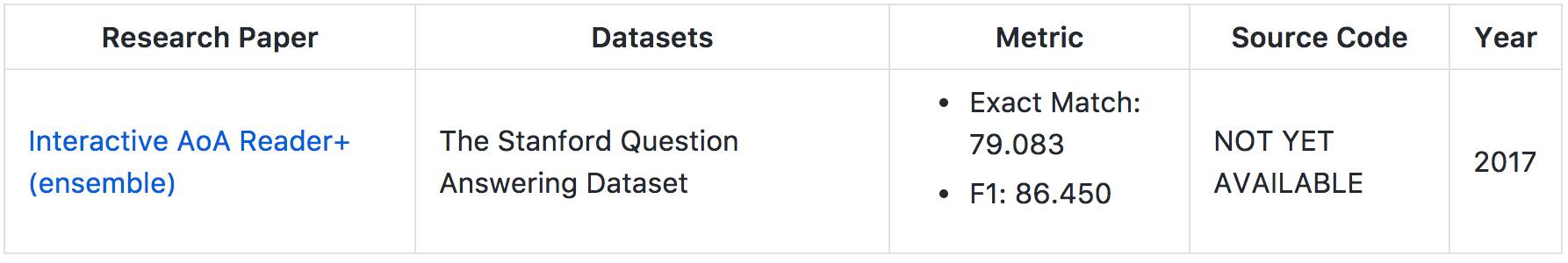 斯坦福问答数据集(SQuAD)是一个新型阅读理解数据集,该数据集中的问答是基于维基百科并由众包的方式完成的。小编并没有找到该论文,如下 GitHub 地址给出的是该数据集和评估该数据集的模型。