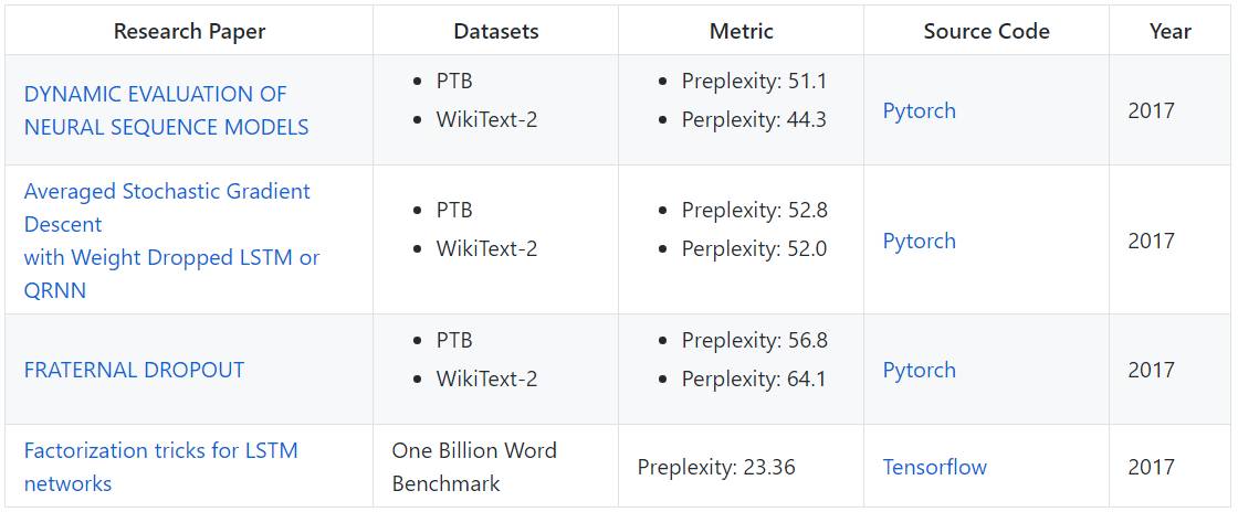 以下展示了语言建模方面当前顶尖的研究成果及它们在不同数据集上的性能。
