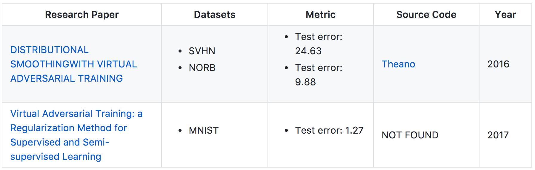第二篇论文提出了一种基于虚拟对抗损失的新正则化方法:输出分布的局部平滑度的新测量手段。由于平滑度模型的指示是虚拟对抗的,所以这一方法又被称为虚拟对抗训练(VAT)。VAT 的计算成本相对较低。本文实验在多个基准数据集上把 VAT 应用到监督和半监督学习,并在 MNIST 数据上取得了 Test Error 1.27 的优异表现。